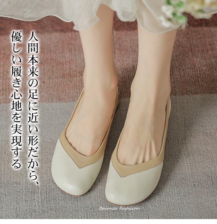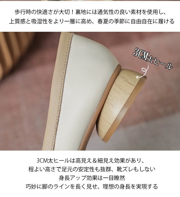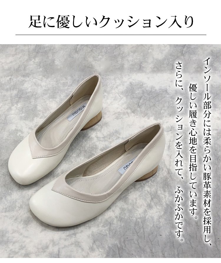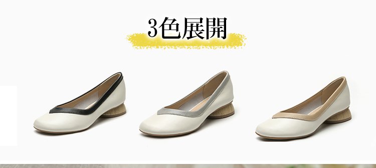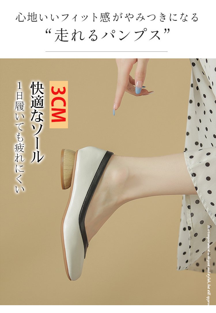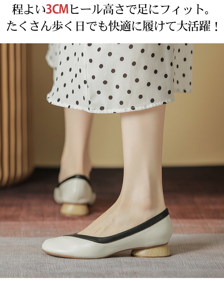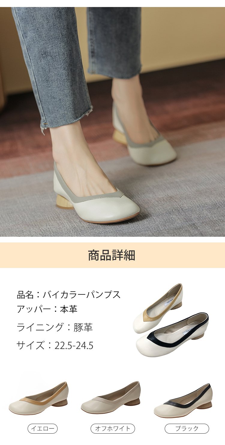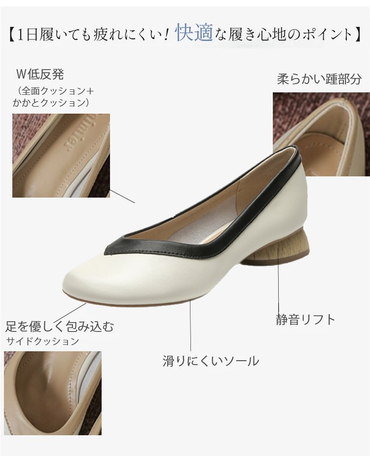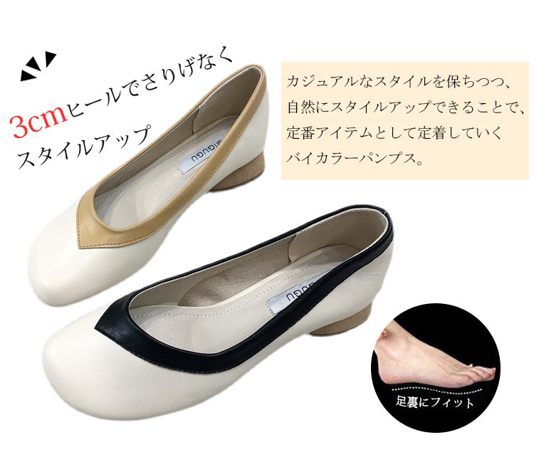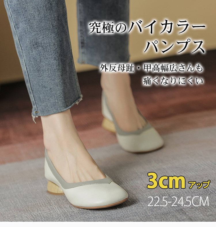 【バイカラーパンプス】本革、太ヒール、3cm身長アップ、クッション入りインソール、幅広デザイン、滑り止め